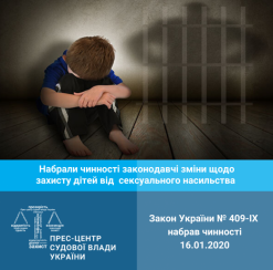 16.01.2020 набув чинності Закон України від 19.12.2019 № 409-IX   "Про внесення змін до деяких законодавчих актів України щодо впровадження Єдиного реєстру осіб, засуджених за злочини проти статевої свободи та статевої недоторканості малолітньої особи, та посилення відповідальності за злочини, вчинені проти статевої свободи та статевої недоторканості малолітньої особи". Цей Закон вносить зміни до п'яти законодавчих актів: Кримінального кодексу України, Кримінального процесуального кодексу України, Кримінального виконавчого кодексу України, Законів України про нотаріат, про адміністративний нагляд за особами, звільненими з місць позбавлення волі.