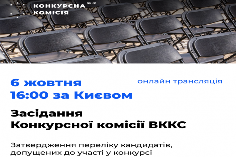 06 жовтня 2022 року о 16.00 відбудеться офіційне засідання Конкурсної комісії з добору кандидатів на посади членів Вищої кваліфікаційної комісії суддів України (Конкурсна комісія). Під час засідання буде затверджений перелік кандидатів, які за результатами перевірки документів на відповідність вимогам Закону України «Про судоустрій та статус суддів» допущені до участі у конкурсі. Офіційне засідання буде транслюватись в онлайн-режимі на офіційному сайті Вищої ради правосуддя, та офіційних каналах Конкурсної комісії – Facebook та YouTube українською та англійською мовами.